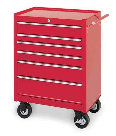 Ball-Bearing Tool Cabinets and Chests Rolling Cabinet,26 1/2 W,6 Drawe?Rolling Cabinet, Width 26 1/2 In, Depth 18 In, Height 34 In, Caster Type Plastic, 2 Swivel And 2 Fixed Locking, Caster Size 5 x 2 In, Number of Drawers 6, Removable MDF Work Surface, Ball-Bearing Drawer Slides, Drawer Capacity 75 Lb, Storage Capacity 8,245 Cu-In, Load Rating 1200 Lb, Steel, 20 Gauge, Red, Gloss Finish, Internal Keyed Lock, Tubular Handles, Includes Drawer Liners